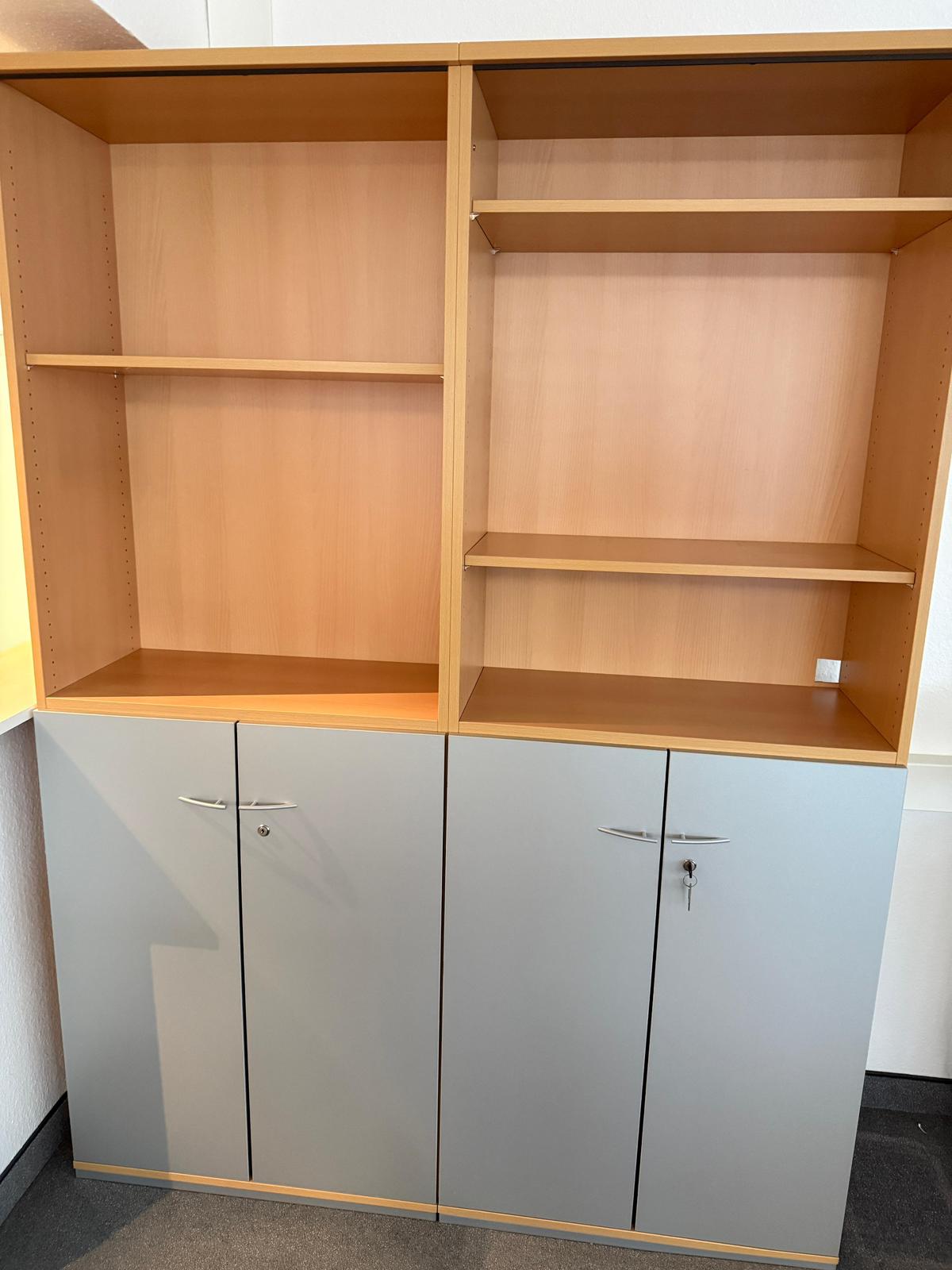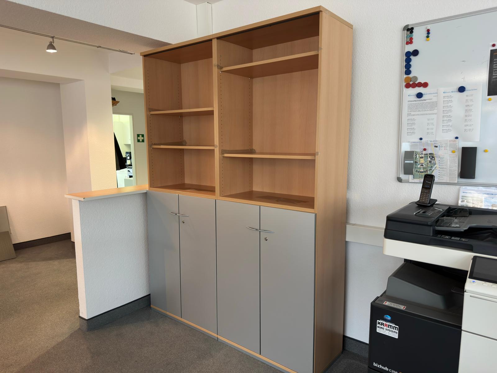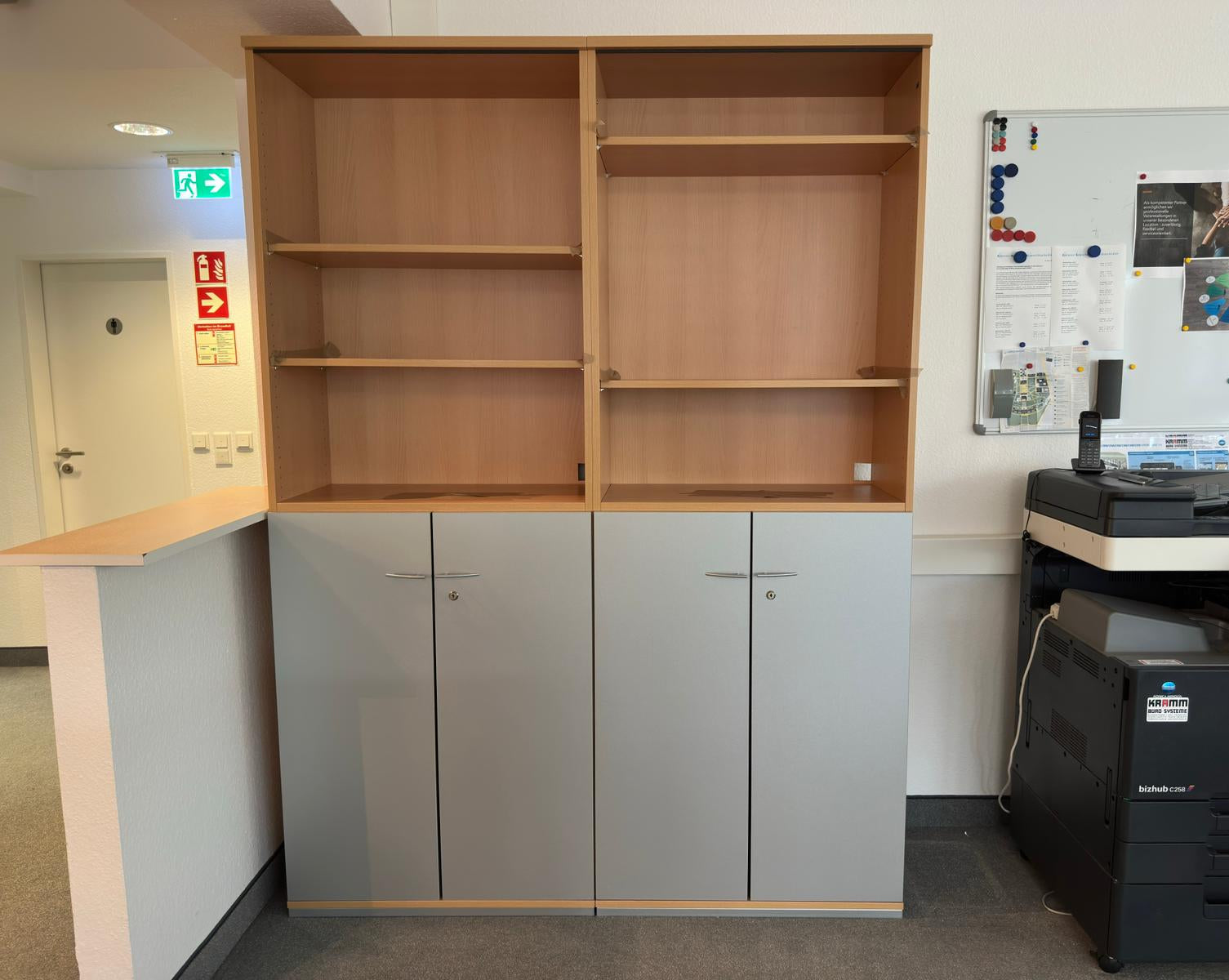 Aktenschrank / Büroschrank – kombinierte Aufbewahrungslösung mit offenen Regalfächern und verschließbaren Türen.