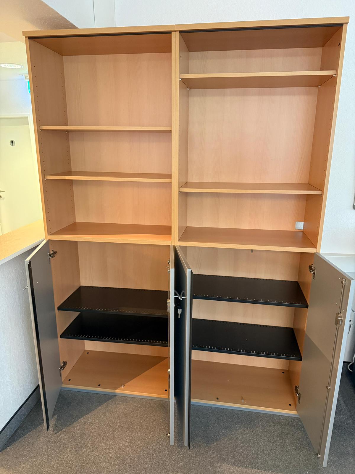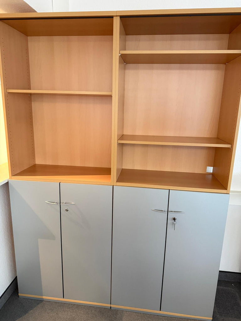Der König & Neurath Aktenschrank vereint modernes Design mit funktionaler Aufbewahrung. Mit seiner eleganten Kombination aus Buche-Dekor und silbernem Korpus bringt er Ordnung und Stil in jedes Büro. Die oberen Fächer ohne Türen eignen sich ideal zur offenen Ablage oder Präsentation, während die unteren Schränke mit Flügeltüren geschlossenen Stauraum für vertrauliche Unterlagen bieten.