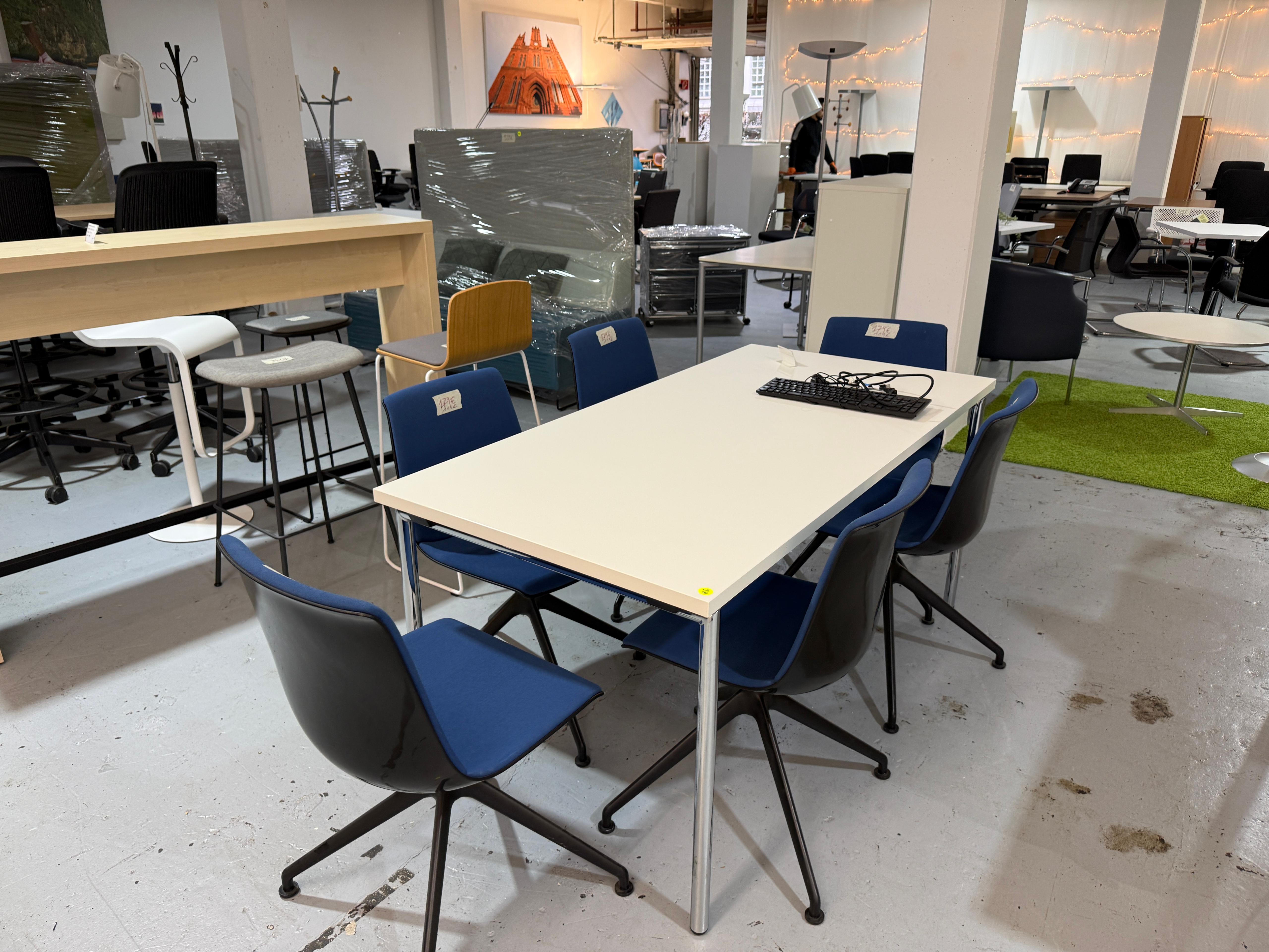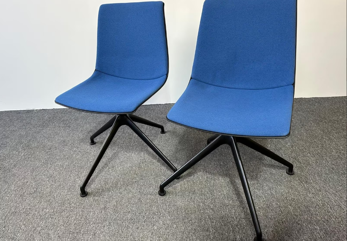 Der Interstuhl SU143 Konferenzstuhl in Blau überzeugt durch modernes Design, hochwertige Verarbeitung und hohen Sitzkomfort. Dank der gepolsterten Sitz- und Rückenfläche eignet sich der Stuhl ideal für Konferenzräume, Besprechungen, Schulungen oder Wartebereiche. Das 4-strahlige Fußkreuz aus schwarz pulverbeschichtetem Aluminium sorgt für Stabilität und eine elegante Optik. Der Stuhl befindet sich in gebrauchtem, sehr gutem Zustand und stammt aus dem Produktionsjahr 2021.