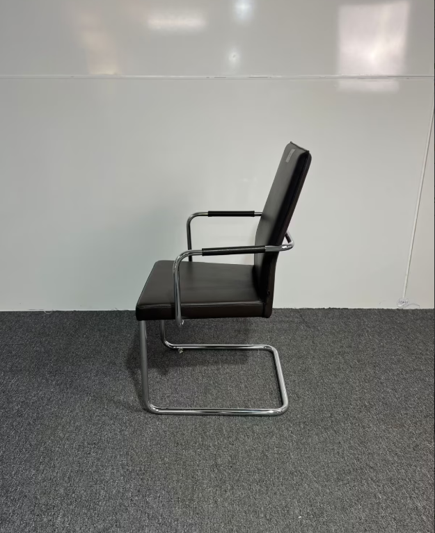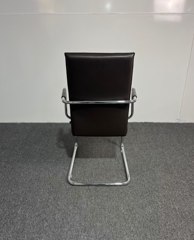 Der KFF Konferenzstuhl in Braun vereint elegantes Design mit höchstem Sitzkomfort und hochwertiger Verarbeitung. Die Sitzfläche und Armlehnen aus braunem Leder sorgen für ein angenehmes Sitzgefühl, während das Gestell aus Chrom dem Stuhl eine edle, moderne Optik verleiht. Der Stuhl eignet sich ideal für Konferenzräume, Besprechungsbereiche oder repräsentative Arbeitsplätze. Der Stuhl befindet sich in gebrauchtem, sehr gutem Zustand.